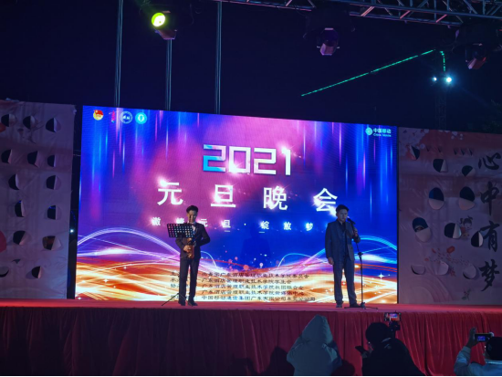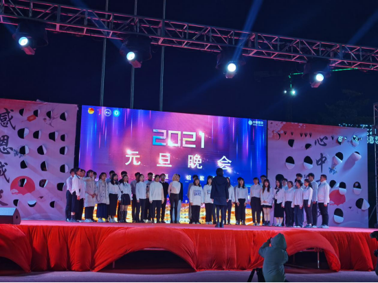2020年12月30日晚7:30,一年一度的元旦迎新晚会在我校田径舞台上华丽上演。广酒学院全体师生带着对新的一年美好期盼欢聚一堂,共度良宵。4位主持人走上舞台,对到场的各位领导、老师、同学们表示热烈的欢迎,随后在全场观众热烈的掌中宣布元旦晚会正式开始。