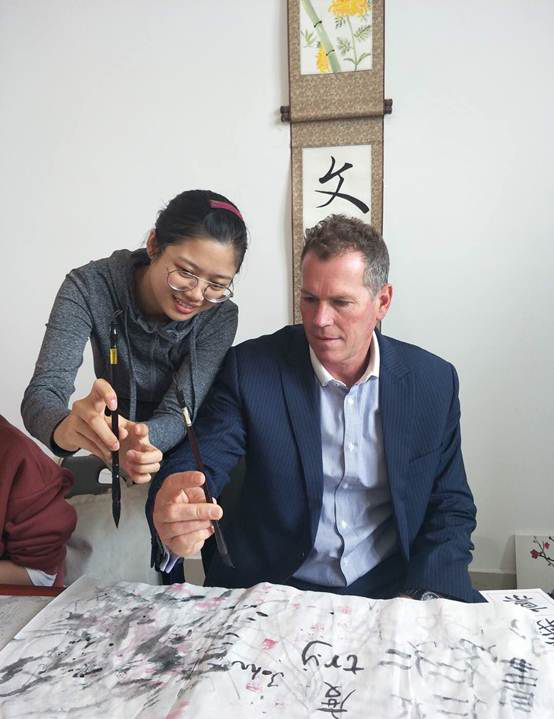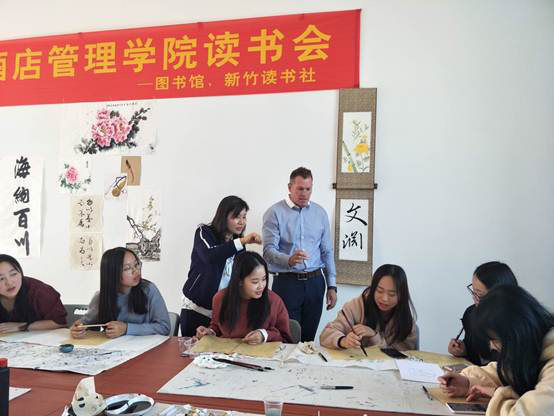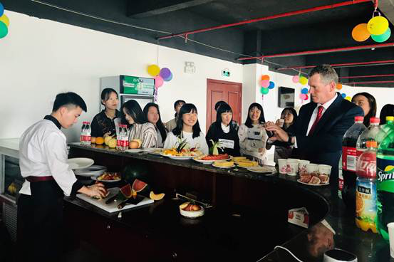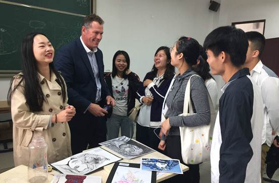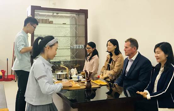 在三天的访问期间,Cook教授的活动安排的密集而富有成效:他先后与我校领导举行了会谈,与英语协会和西餐工艺的同学进行了茶叙座谈,举行了澳大利亚历史文化和风土人情的讲座和TAFE学院教育特色及游学活动的讲座,应邀出席了我校首届运动会开幕式,与读书社、书法绘画协会、体艺系艺术设计师生进行了交流,参观了茶艺实训室并观看茶艺表演。
